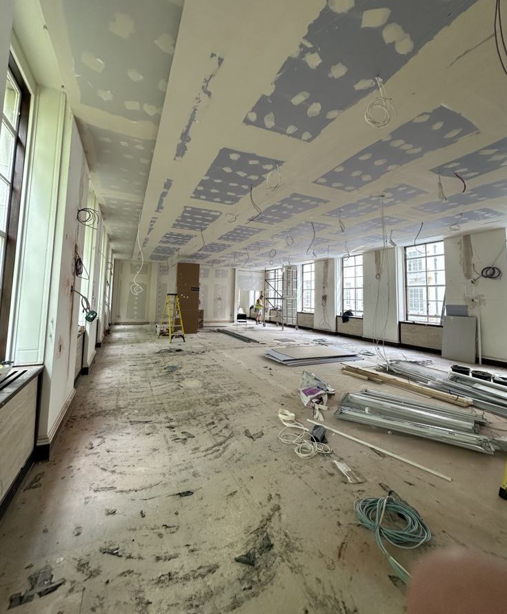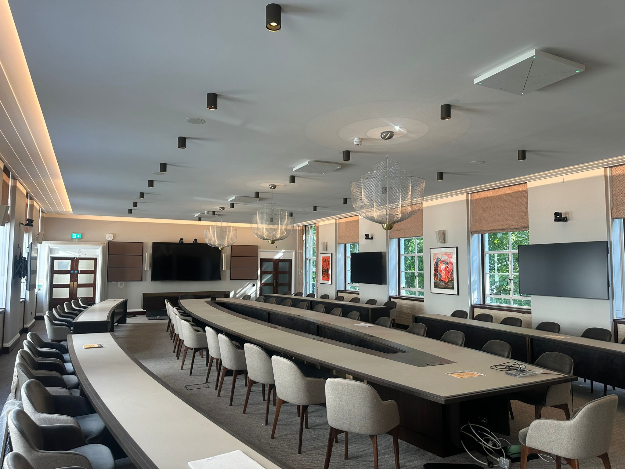 Design & Build collaboration for full refurbishment and fit-out of a state-of-the-art 60-seater Conference Room. Works included design consultation and collaboration, full electrical, AV & data fit-out, bespoke and decorative lighting, new carpet and solid wood flooring, new access-controlled heritage doors, complete redecoration, new ceiling raft, new ornate decorative cornice, fire alarm works, manufacture of bespoke 60-seater conference room tables, furniture, artwork & blinds.